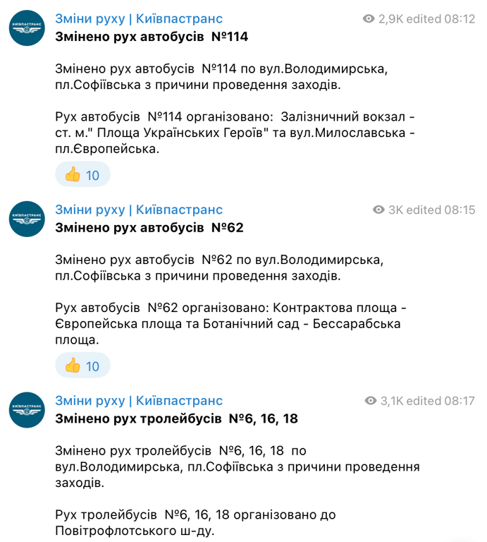 Зазначається, що змінено рух тролейбусів №6, 16, 18 по вул. Володимирська та Софіївська площа з причини проведення заходів.