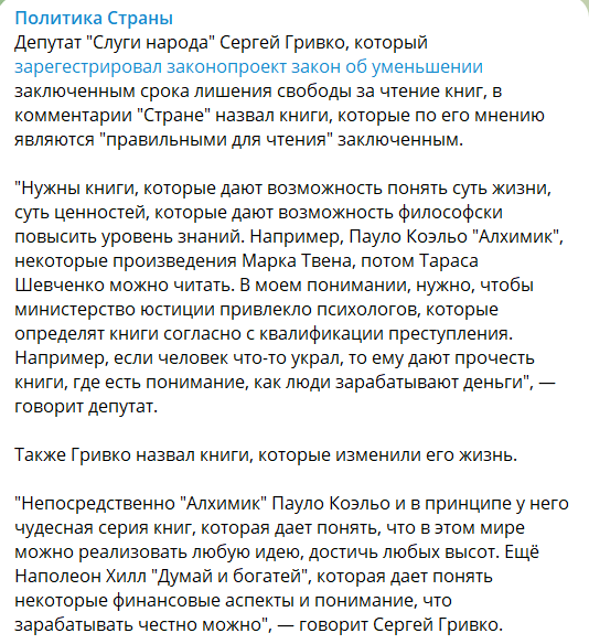 Депутат "Слуги народу" Сергій Гривко, який зареєстрував законопроєкт про скорочення терміну позбавлення волі за читання книг, назвав "правильні", на його думку, книги для ув'язнених. За його словами, деякі твори змінили його життя.