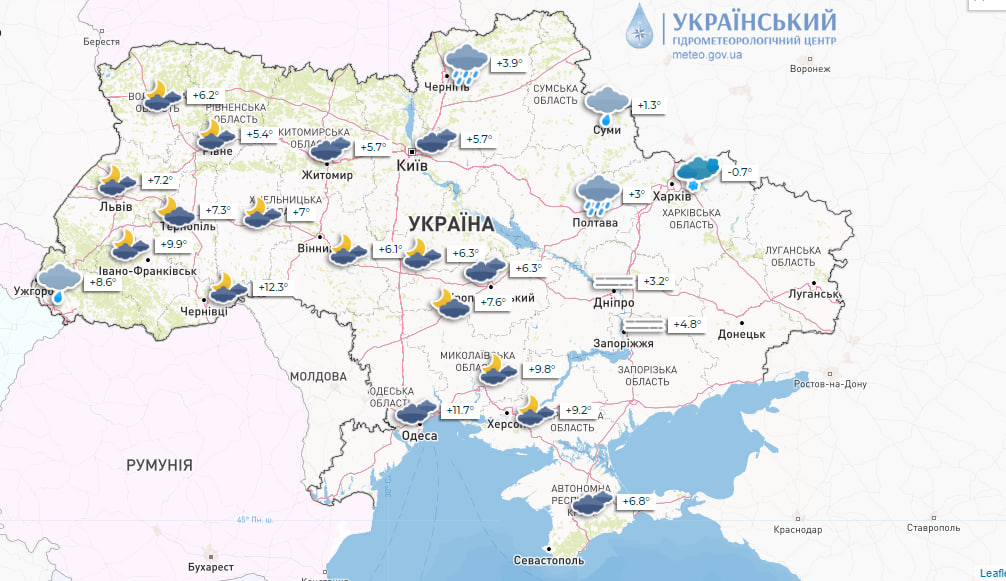 У південній частині, західних та Вінницькій областях помірний дощ (вночі з мокрим снігом), в Карпатах значний сніг, на Закарпатті значний дощ; на решті території місцями невеликі опади. На Лівобережжі та в Карпатах на дорогах подекуди ожеледиця.