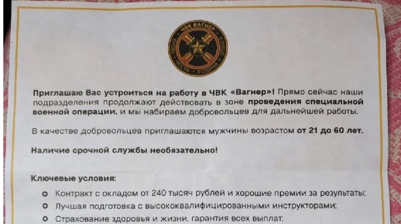 Натомість у конверті виявилася пропозиція приєднатися до лав найманців ПВК "Вагнер". Пропозиція просто рясніла різними "смаколиками": від грошового забезпечення та навчання до страхування.