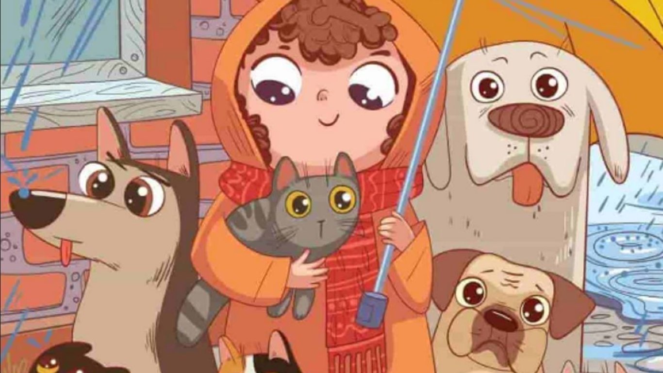 На малюнку видно дівчину з парасолькою, кількох собак та котів. Ллє дощ, навколо утворилися калюжі. Десь серед цієї негоди є й прихований пончик.