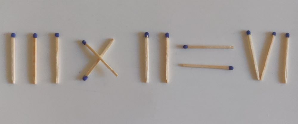 Потрібно пересунути два сірники, щоб зі знака "плюс" вийшов — "помножити": III x II = VI.