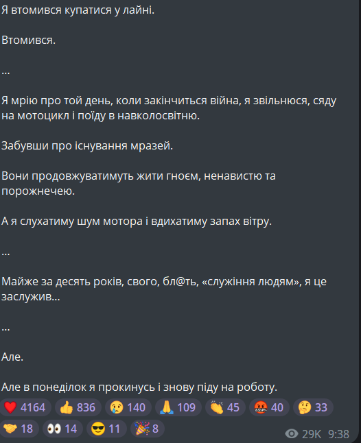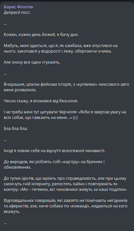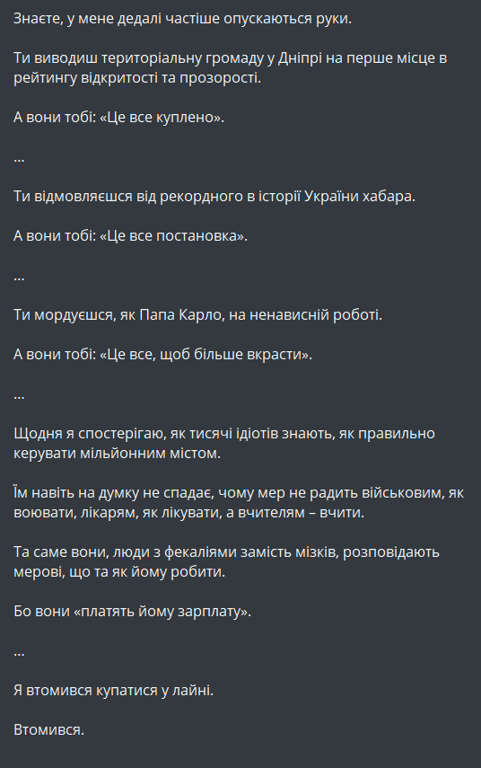 "Кожен, кожен день Божий, я бачу дно. Мабуть, мені здається, що я, як камбала, вже опустився на нього, закопався у водорості і лежу, обертаючи очима. Але знизу все одно стукають", — написав мер Дніпра.