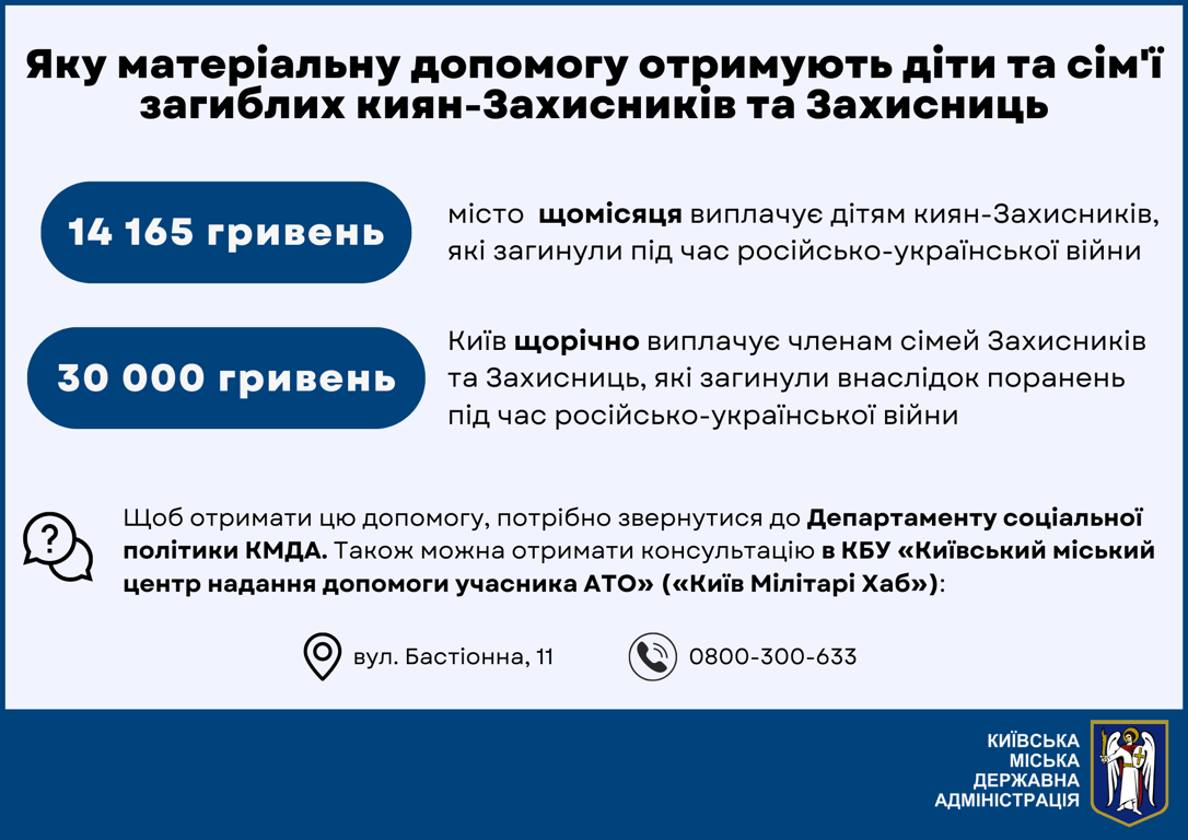 У столиці дітям загиблих захисників щомісячно виплачують по 14 тисяч гривень. Члени родини отримують удвічі більше — 30 тисяч гривень.