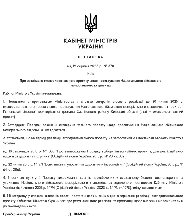 Уряд вирішив перенести будівництво кладовища до села Гатне, що в Київській області. Зазначається, що для облаштування кладовища у селі Гатне виділять дві земельні ділянки площею 258,73 га і 7,96 га.