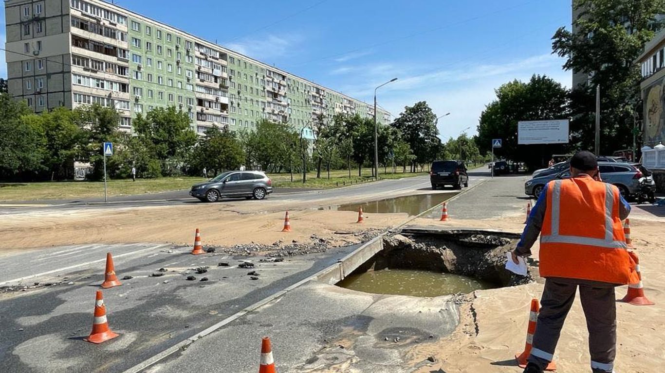 У Дарницькому районі Києва трубопровід прорвався прямо посередині проїжджої частини. Транспортний рух ускладнений .