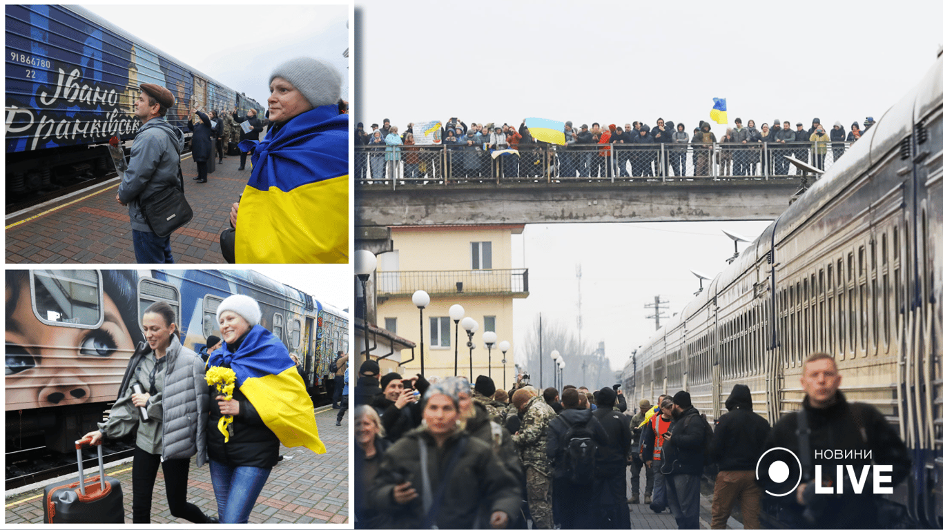 До деокупованого Херсона прибув перший за час війни пасажирський поїзд. На міському вокзалі його урочисто зустрічали регіональна влада, військові та містяни.