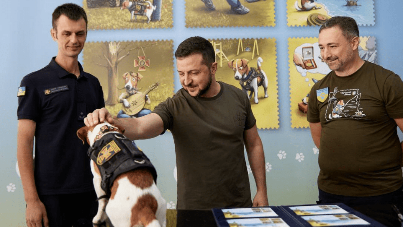 Пес Патрон разом з Зеленським погасив поштову марку зі своїм зображенням (фото)