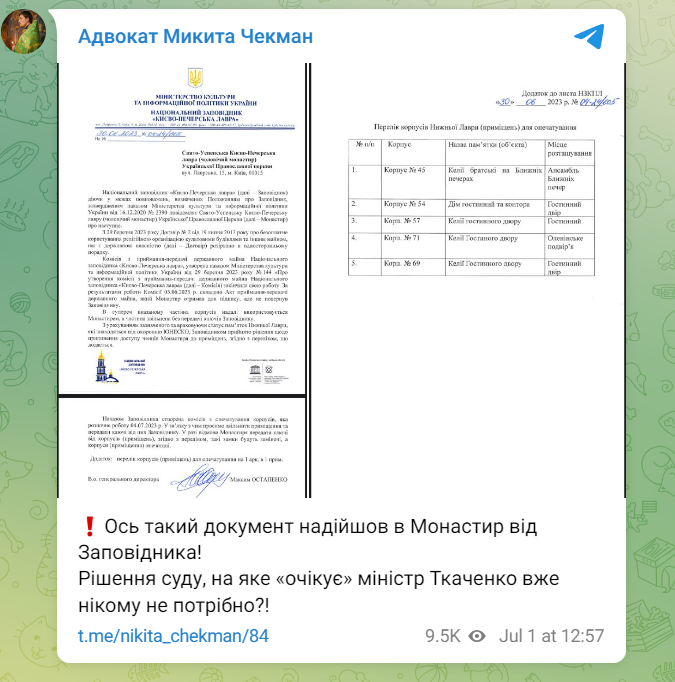 "5 червня спецкомісія склала Акт приймання-передачі державного майна, який Монастир отримав для підпису, але не повернув Заповіднику. Зазначається, що представники Монастиря й надалі використовують частину корпусів Лаври", — кажуть у "Суспільному".