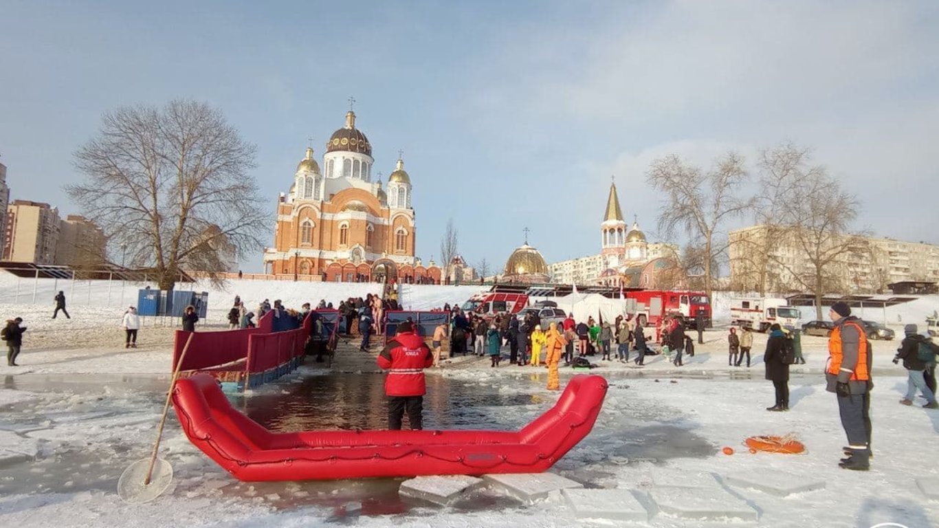Ранок на Оболонській набережній біля собору почався точно не з кави та навіть не з освячення води. Ще до прибуття священників місцеві любителі холодних температур заполонили ополонку. Поруч чергують рятувальники у захисних помаранчевих костюмах - а повз них, охаючи та ахаючи, пробігають кияни та киянки в купальниках, плавках, а дехто навіть у шапках. На початку 11 години ранку священослужителі таки дісталися берега: окропили водою вірян, що стояли та мерзли на березі - температура опустилася до позначки -17.