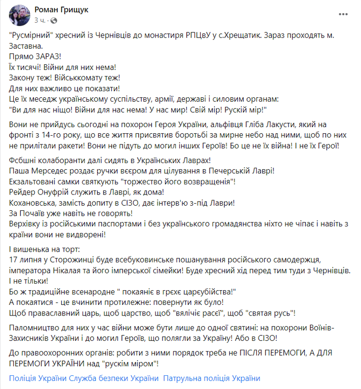 "Фсбшні колаборанти далі сидять в Українських Лаврах! Паша Мерседес роздає ручки вєєром для цілування в Печерській Лаврі! Екзальтовані самки святкують "торжество його возвращенія"! Рейдер Онуфрій служить в Лаврі, як дома! Кохановська, замість допиту в СІЗО, дає інтерв'ю з-під Лаври! За Почаїв уже навіть не говорять! Верхівку із російськими паспортами і без українського громадянства ніхто не чіпає і навіть з країни вони не видворені!" — наголосив Роман Грищук.