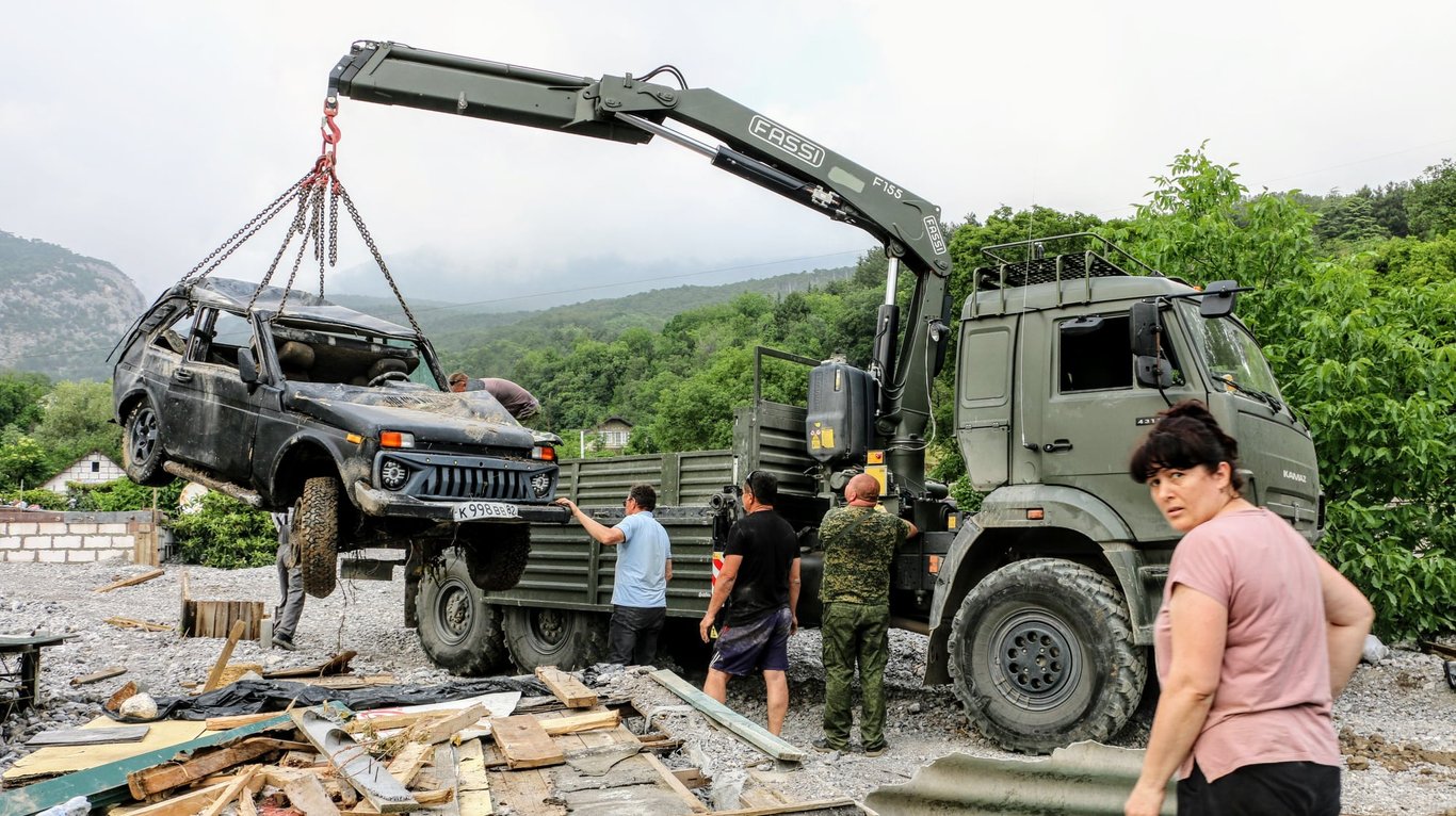 Свои поврежденные транспортные средства местные жители доставали с помощью кранов.