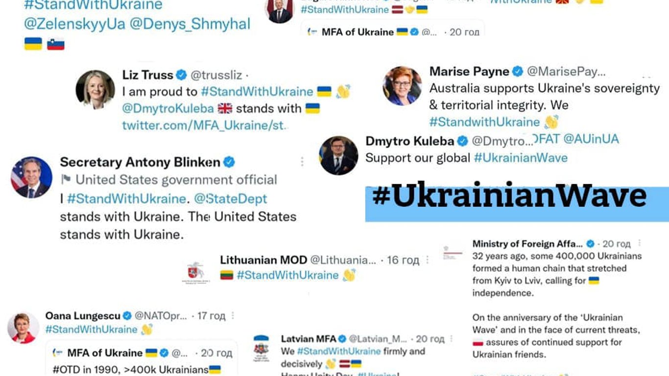 "Мы сделали это, чтобы продолжить дело более 400 тысяч украинцев, которые 32 года назад, стремясь к Независимости, объединились в "живую цепь" от Киева до Львова. Это назвали Украинской Волной. Вчера на наш призыв слова поддержки I stand with Ukraine из эмоджи "wave" заполонили глобальное пространство сети Twitter", - написал глава МИД.