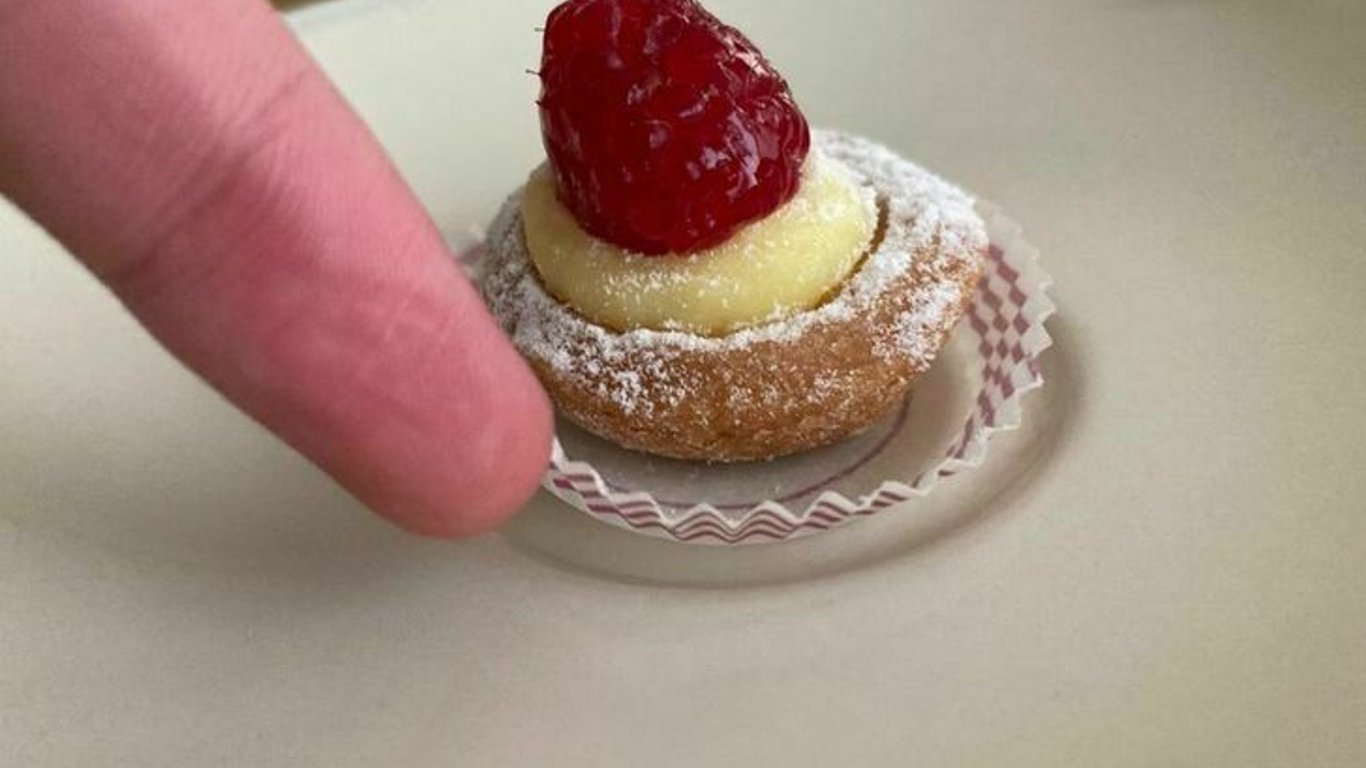 Немногим более пальца руки, такой размер пирожного сделанного настоящим ювелиром кулинарного искусства.