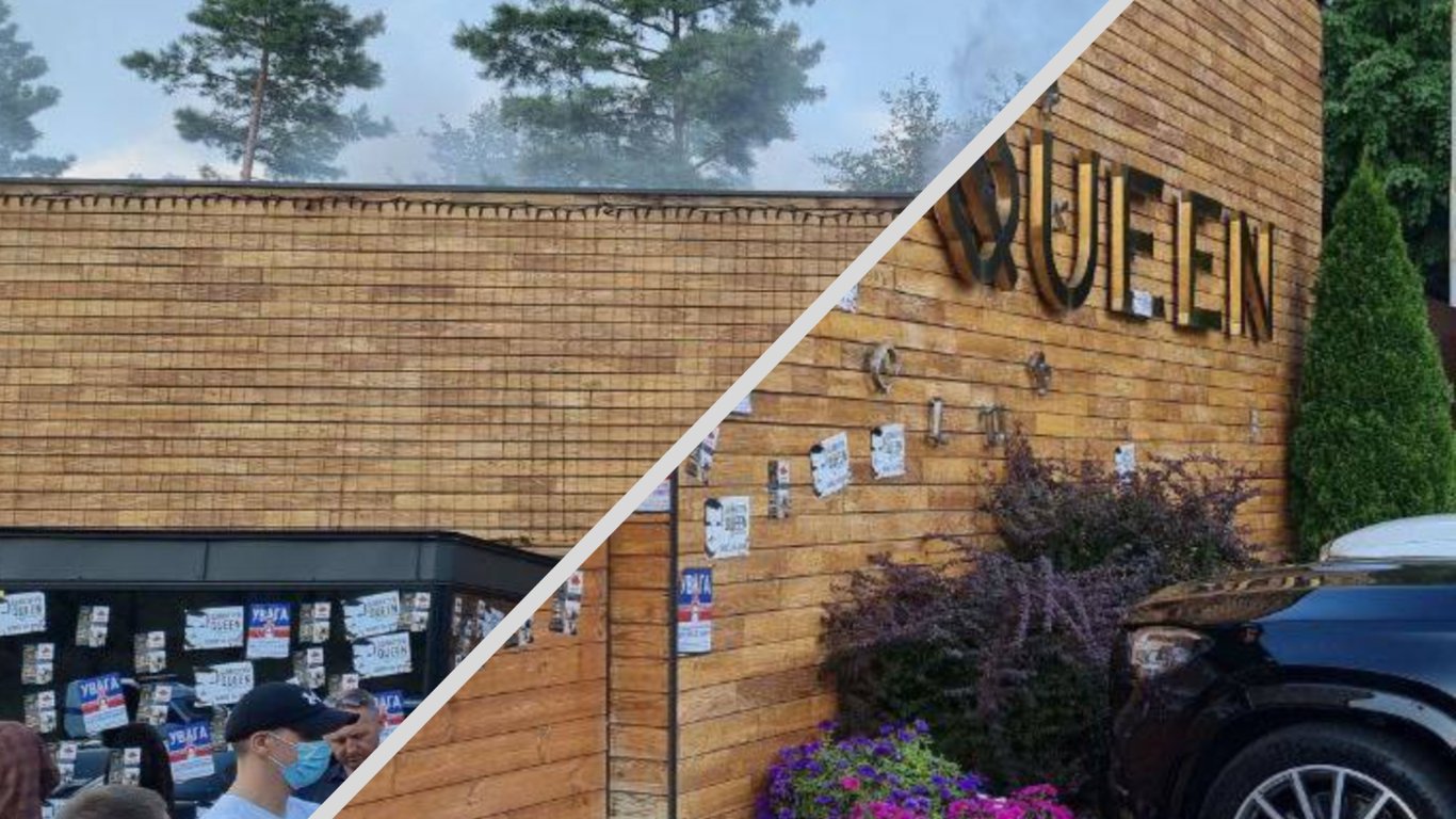 Националисты забросали дымовыми шашками и обклеили стикерами клуб "Queen country club" под Киевом в Конча-Заспе, который принадлежит россиянину Александру Орлову.