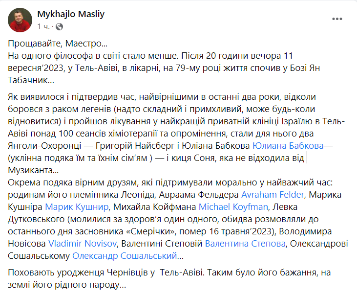"Похоронят уроженца Черновцов в Тель-Авиве. Таково было его желание, на земле его родного народа...", — написал он.
