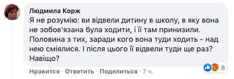 Между тем, кое-кто из участников группы написал, что не понимает, зачем ребенок пошел на уроки, к которым уже не имеет никакого отношения. Более того - если среди одноклассников есть те, кто не вступился за девушку, а со всеми смеялся, то зачем она их навещала.