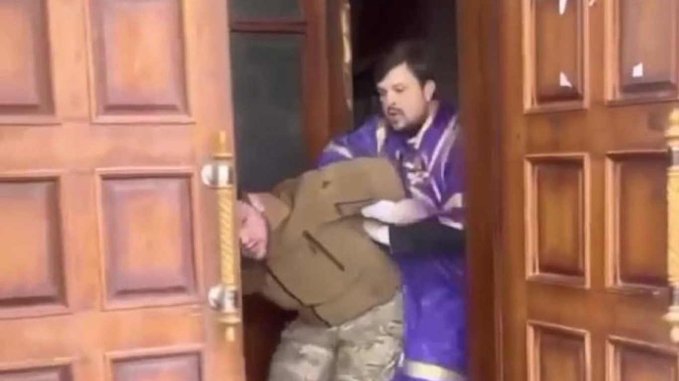 Депутат Хмельницкого облсовета Виктор Бурлык обнародовал видео, как в Хмельницком священники Украинской православной церкви Московского патриархата напали на мужчину в форме Вооруженных сил Украины прямо в церкви.
