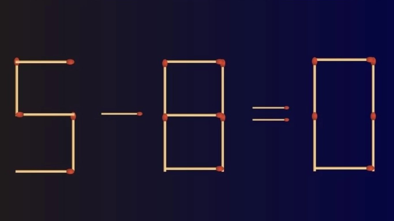 Головоломки со спичками в последнее время стали очень популярными задачками в социальных сетях. Исправьте уравнение 5-8=0, переместив одну спичку.