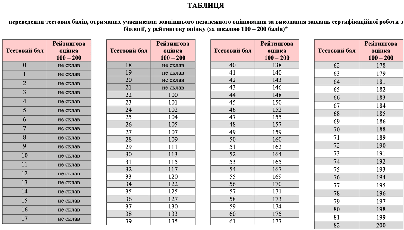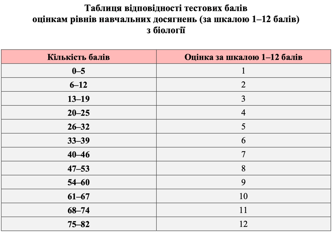 Кроме этого, результаты ВНО по биологии могут быть учтены, как государственная итоговая аттестация за школьный курс по предмету. Соответственно, Украинский центр оценивания качества образования составил и утвердил отдельную таблицу перевода тестовых баллов в шкалу 1-12 баллов.