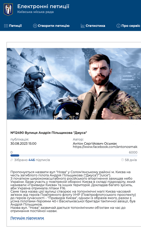 "Именно такое название этой улицы создает на топонимические карте Киева временная связь от героев Воздушного флота УНР (Воздухофлотского проспекта) до героев современности — "Призраков Киева", одним из образов которого, вместе со всеми пилотами-героями 40-й тактики Васильковской бригады" авиации, был Андрей Пильщиков", — говорит автор петиции.