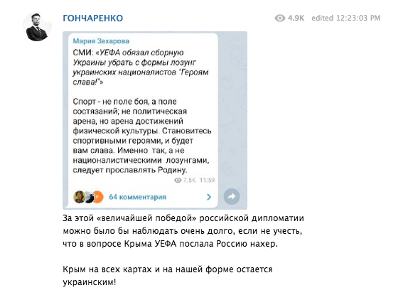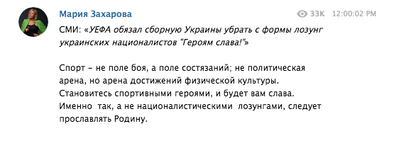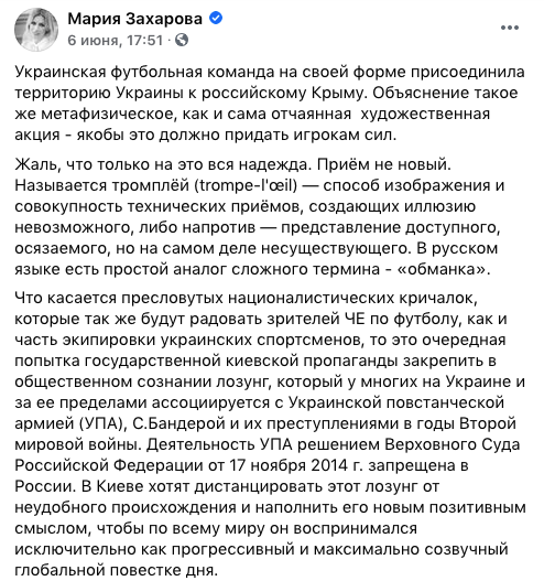 6 июня, когда сборная Украины представила обновленную форму, пресс-секретарь российского МИД Мария Захарова бурно отреагировала на это и написала, что "украинская футбольная команда на своей форме присоединила территорию Украины в Крым". По ее словам, так наше государство создает "иллюзию невозможного".