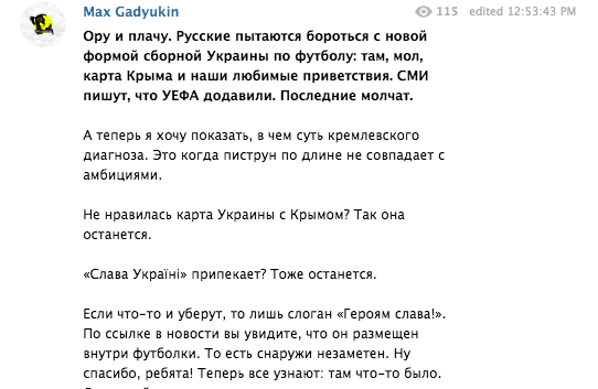 Между тем, журналист издания "Петр и Мазепа" Макс Гадюкин лишь высмеял попытки России навязать Украине свое видение "футбольных стандартов". По его мнению, влияние, которое Российская Федерация хочет иметь в мире, не совпадает с реальными возможностями.