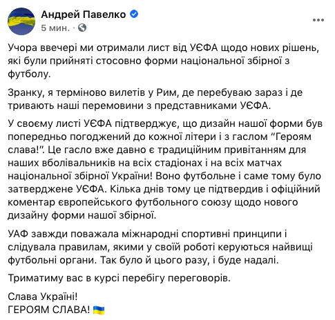 Чтобы поставить окончательную точку в решении вопроса логотипов и букв, которые должны остаться на форме украинских игроков, президент Украинской Ассоциации футбола Андрей Павелко вылетел в Рим на переговоры с представителями УЕФА.