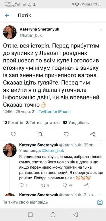 Сама пассажирка рассказала, мол, перед прибытием к остановке во Львове, проводник прошелся по всем купе и объявил стоянку на час, якобы из-за того, что опаздывает прицепной вагон.