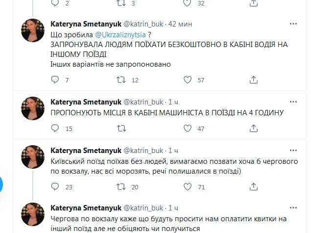 По ее словам, пассажирам, которых "забыли", предложили доехать до Киева бесплатно в кабине водителя другого поезда.