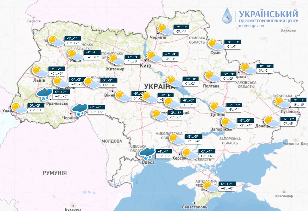 Температура воздуха ночью будет колебаться от 6 до 11 мороза, на юге – от 1 до 6 мороза, на юге Одесской области и на западе – от 3 мороза до 2 тепла.