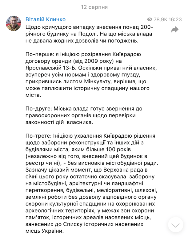 "Я ініціюю розірвання Київрадою договору оренди (від 2009 року) на Ярославській 13-Б. Оскільки приватний власник, всупереч усім нормам і здоровому глузду, прикрившись листом Мінкульту, вирішив, що може паплюжити історичну спадщину нашого міста", — сказав Кличко.