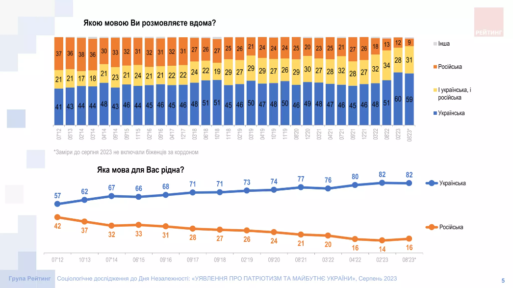 Дослідження показало, що лише 9% українців вдома спілкуються російською. Близько 30% говорять з родичами та друзями як українською, так і російською, а майже 60% вдома спілкуються виключно українською. Зазначено, що 82% мають рідну українську мову, 16% — російську.