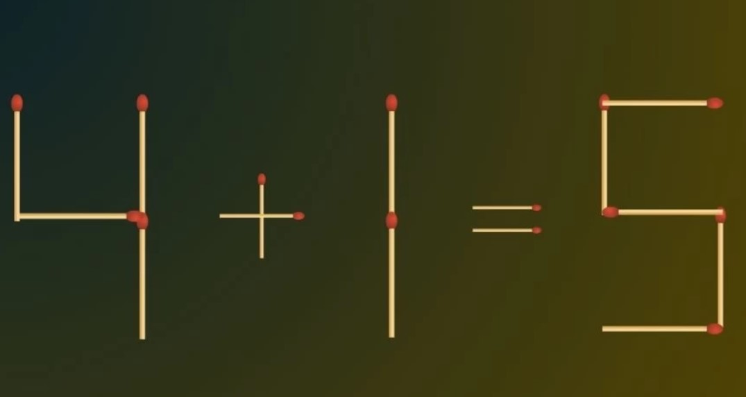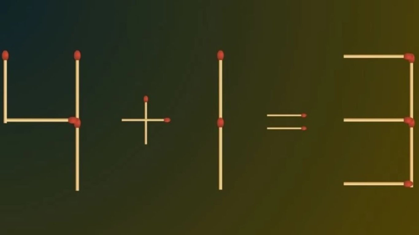 Арифметичне рівняння 4+1=3 є очевидно неправильним. Перемістіть один сірник так, щоб виправити рівняння.