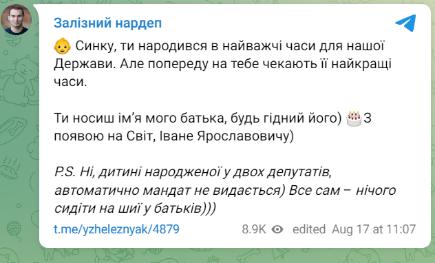 "Синку, ти народився в найважчі часи для нашої Держави. Але попереду на тебе чекають і найкращі часи. Ти носиш імʼя мого батька, будь гідний його. З появою на Світ, Іване Ярославовичу. P. S. Ні, дитині, народженої у двох депутатів, автоматично мандат не видається. Все сам — нічого сидіти на шиї у батьків", — написав депутат.
