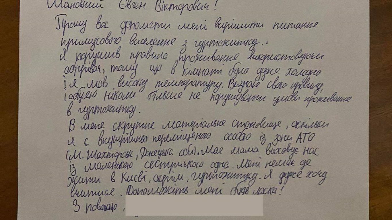 Студент під час холодів увімкнув обігрівач у своїй кімнаті. Це порушує правила проживання в гуртожитку і на цьому його спіймала керівниця("забороняється використовувати електропобутові прилади, не зазначені у договорі найму жилої площі в гуртожитку, без дозволу адміністрації гуртожитку закладу освіти"). Тепер хлопцю погрожують виселенням. Він прибув до університету навчатися із тимчасово окупованих територій Донецької області і в заяві на ім'я вишу написав, що в Києві йому більше нема де проживати.