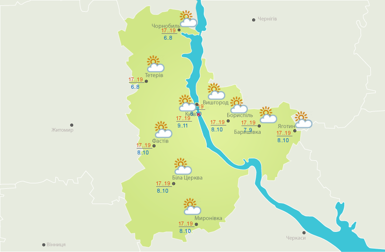 На Київщині температура повітря вдень прогріється до 17...19 градусів, вночі буде — 9...11. Вітер північно-західний 5-10 м/с.