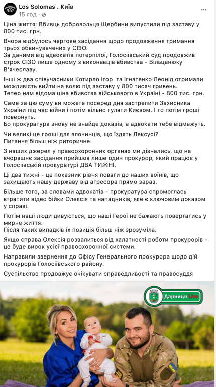 "Інші ж два співучасники — Котирло Ігор та Ігнатенко Леонід — отримали можливість вийти на волю під заставу у 800 тисяч гривень. Саме за цю суму ви можете посеред дня застрелити Захисника України під час війни і потім вільно гуляти Києвом. Та й потім гроші повернуть. Бо прокуратура знову не знайде доказів, а адвокати тебе відмажуть. Чи великі це гроші для злочинців, що їздять "Лексусі"? Питання більш ніж риторичне", — пишуть у соцмережах.