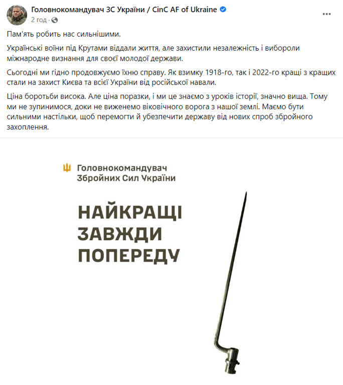"Українські воїни під Крутами віддали життя, але захистили незалежність і вибороли міжнародне визнання для своєї молодої держави. Сьогодні ми гідно продовжуємо їхню справу. Як взимку 1918-го, так і 2022-го кращі з кращих стали на захист Києва та всієї України від російської навали. Ціна боротьби висока. Але ціна поразки, і ми це знаємо з уроків історії, значно вища. Тому ми не зупинимося, доки не виженемо віковічного ворога з нашої землі", — написав Залужний.